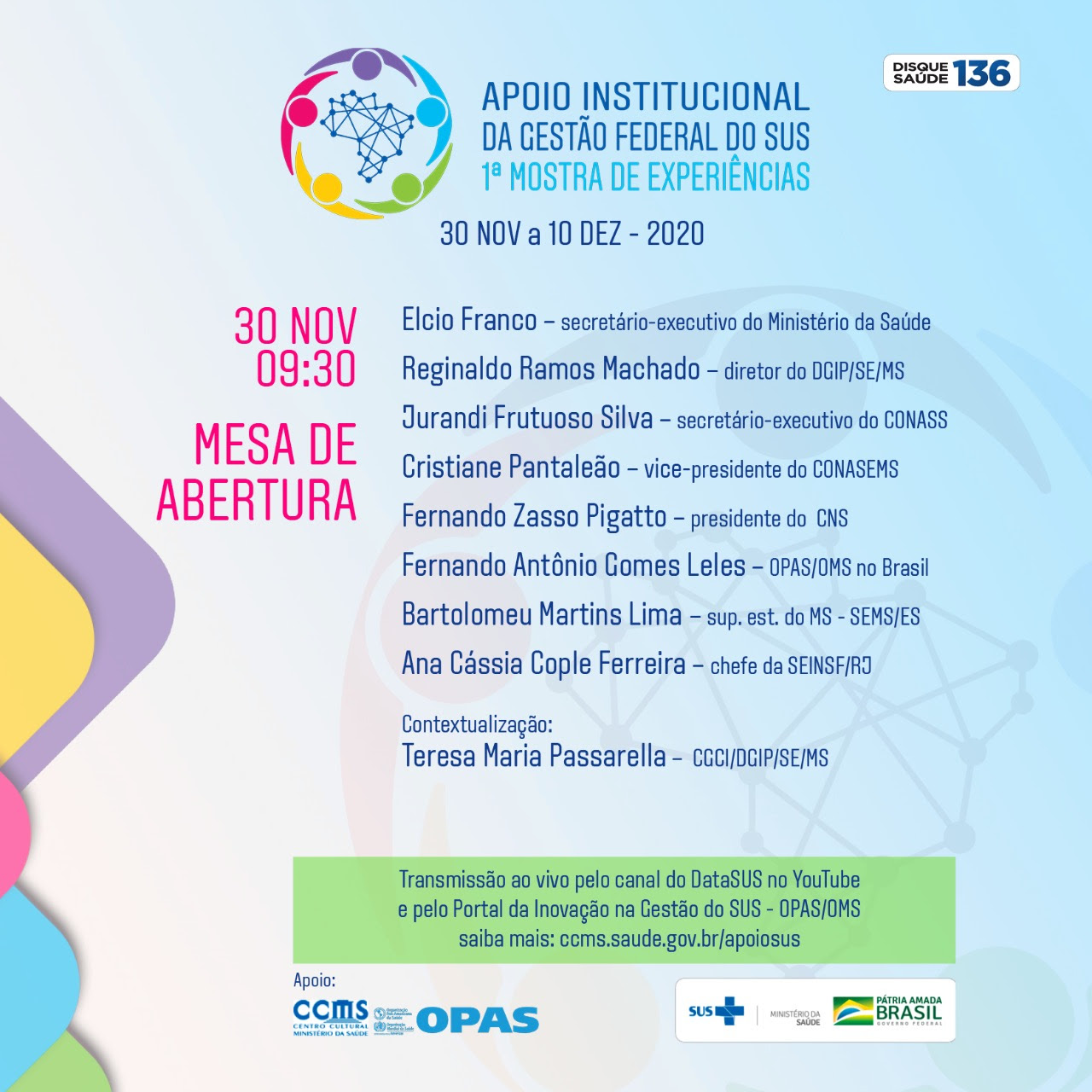 A inscrição de ouvinte está disponível no link https://linktr.ee/apoioinstitucionalms e será emitido certificado de participação. Outras informações em http://www.ccms.saude.gov.br/apoiosus