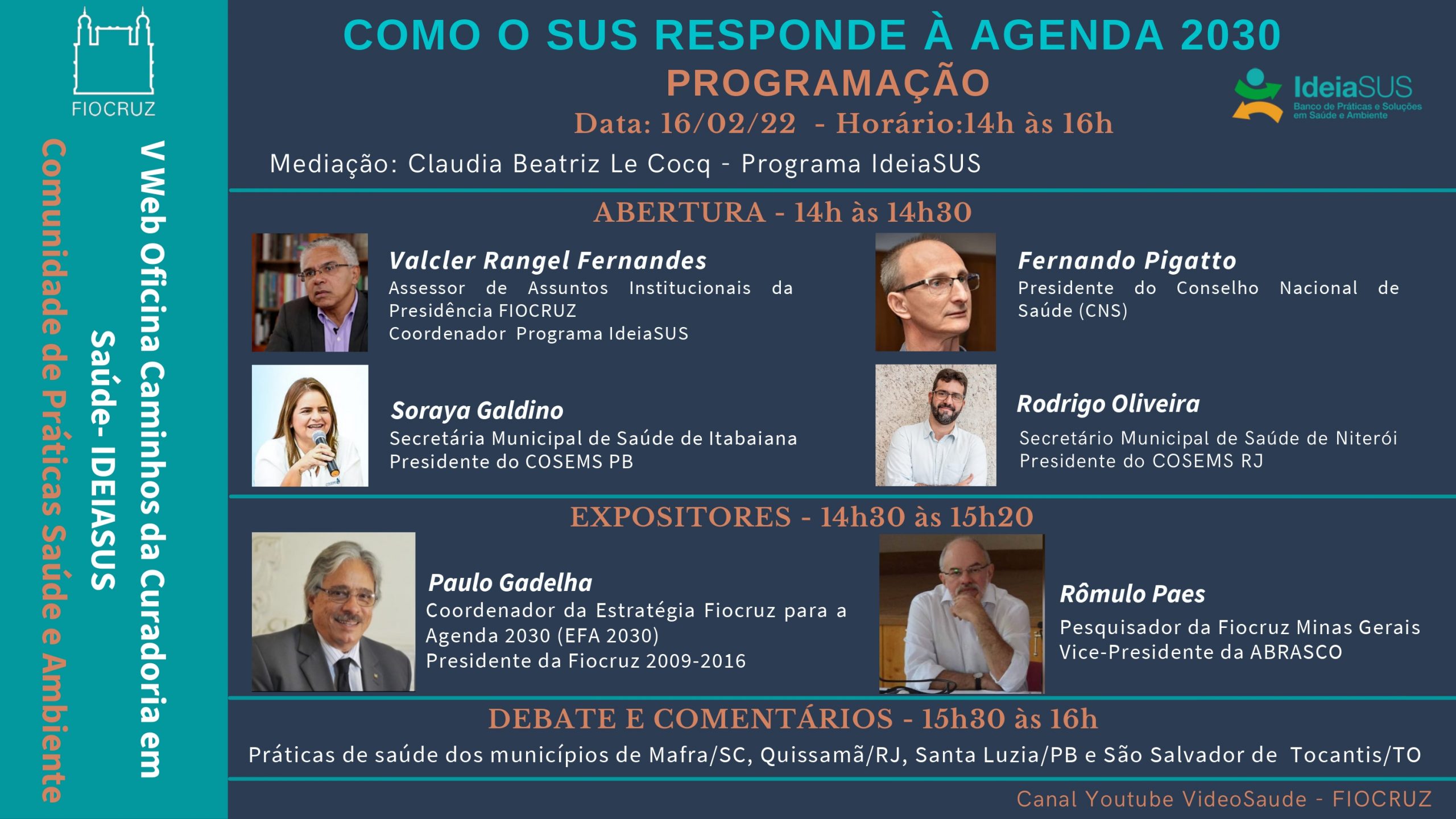 O IdeiaSUS/Fiocruz, através do Projeto IdeiaSUS: Curadoria em Saúde, o desafio de apoiar, qualificar e multiplicar práticas e soluções, promove no dia 16/02, das 14h às 16h, a 5ª edição da WebOficina Caminhos da Curadoria em Saúde. O tema Como o SUS responde à Agenda 2030 – Objetivos de Desenvolvimento Sustentável será abordado por Paulo Gadelha, coordenador da Estratégia Fiocruz para a Agenda 2030 e ex-presidente da Fiocruz (2009-2016), e Rômulo Paes, pesquisador da unidade da Fiocruz em Minas Gerais e vice-presidente da Abrasco. O objetivo é discutir os desafios da Agenda 2030, ou seja, deste plano de ação da ONU para o enfrentamento de questões urgentes que afligem nossos tempos, para o desenvolvimento dos municípios.