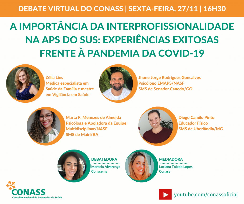 O Debate Virtual do Conass desta sexta-feira (27/11) irá tratar da importância da interprofissionalidade na Atenção Primária à Saúde do SUS, apresentando experiências exitosas frente à pandemia da Covid-19