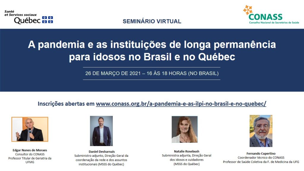 O seminário virtual irá discutir a experiência brasileira e de Quebec no enfrentamento da pandemia, com a apresentação dos dados disponíveis sobre a realidade dos idosos institucionalizados em ambas as regiões, enfatizando as iniciativas governamentais e não governamentais que contribuíram para o enfrentamento da doença.
