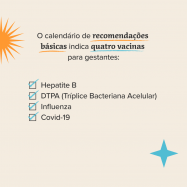 O Sistema Único de Saúde (SUS) disponibiliza, para gestantes, duas vacinas contra tétano. A dupla-adulto, que protege contra difteria e tétano, com o esquema vacinal de três doses, de acordo com o histórico de proteção. Já a dTpa (difteria, tétano e coqueluche acelular) deve ser administrada a cada nova gestação, a partir da 20ª semana de gravidez. A vacina contra hepatite B, que protege contra inflamação no fígado, a da gripe, que protege contra os principais tipos de vírus influenza, que provocam a gripe. Além disso, a vacina contra Covid-19, aquelas que têm algum problema de saúde devem ser imunizadas com doses da Coronavac ou Pfizer.
