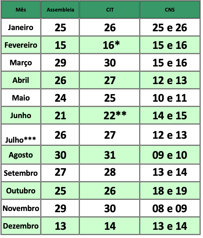 Calendário de reuniões da assembleia do Conass, reuniões da Comissão Intergestores Tripartite (CIT) e Conselho Nacional de Saúde (CNS) em 2024