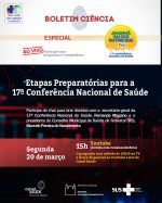 O Boletim Ciência na próxima segunda-feira, dia 20, será especial. O programa, ao vivo, pelo YouTube do Canal Saúde, será sobre as Etapas Preparatórias para a 17ª Conferência Nacional de Saúde. Durante a transmissão, será possível tirar todas as dúvidas sobre a realização das etapas municipais e das conferências livres que antecedem a etapa estadual e a etapa nacional do maior evento de discussão do Sistema Único de Saúde (SUS) e participação popular do país.