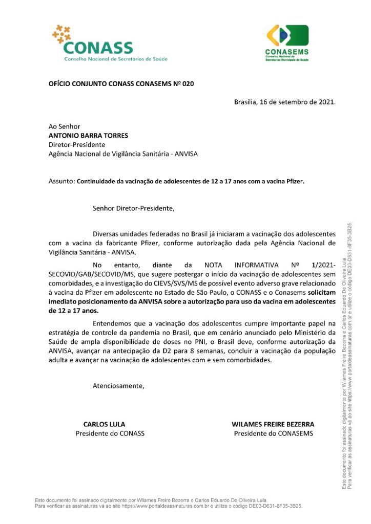 Conass e Conasems consultam a Anvisa sobre a autorização para uso da vacina em adolescentes de 12 a 17 anos