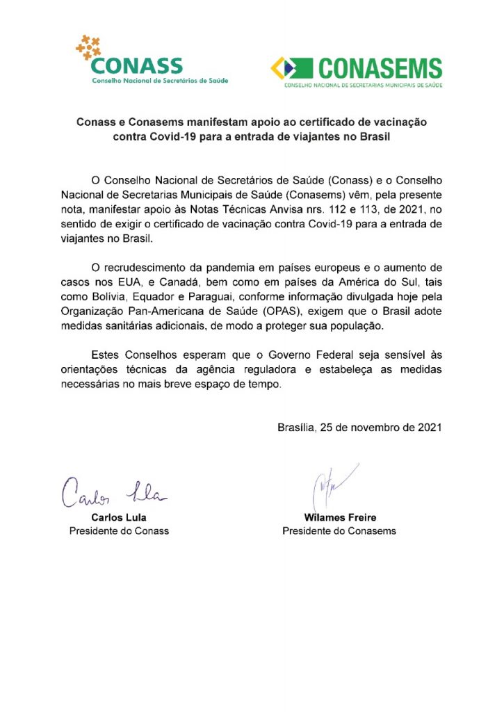 O Conselho Nacional de Secretários de Saúde (Conass) e o Conselho Nacional de Secretarias Municipais de Saúde (Conasems) vêm, pela presente nota, manifestar apoio às Notas Técnicas Anvisa nrs. 112 e 113, de 2021, no sentido de exigir o certificado de vacinação contra Covid-19 para a entrada de viajantes no Brasil.