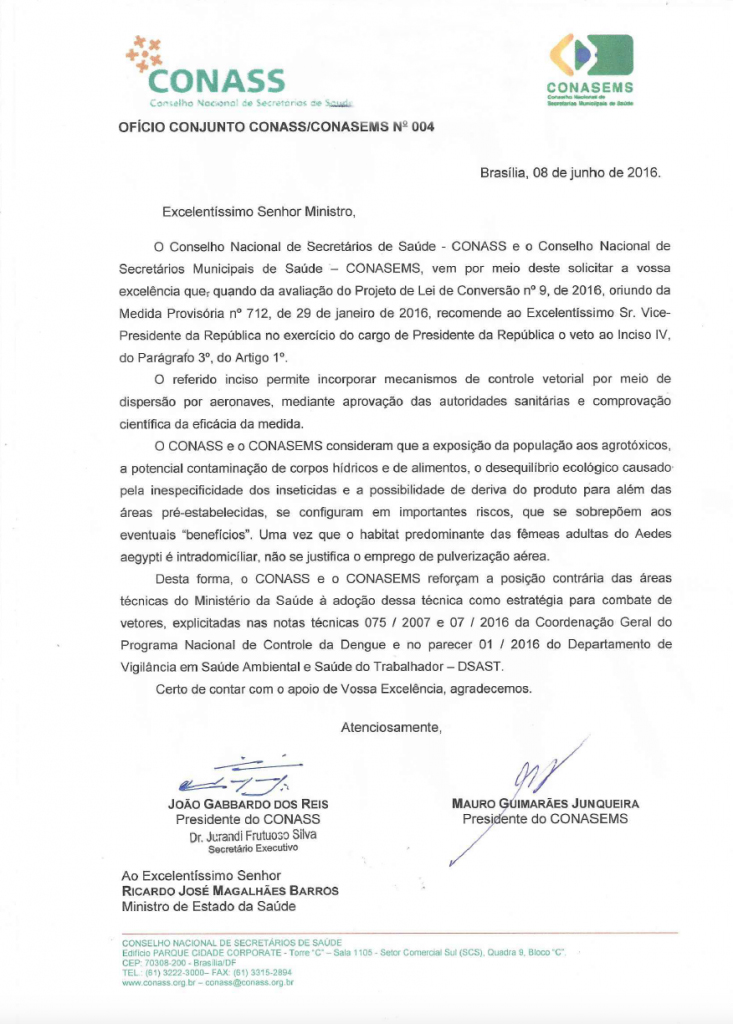 Os gestores estaduais e municipais de saúde entendem que os riscos envolvidos se sobrepõem aos eventuais benefícios, com potencial ameaça à saúde das pessoas e ao meio ambiente. Além disso, o habitat predominante das fêmeas adultas do Aedes aegypti é intradomicíliar, o que não justifica a pulverização aérea.