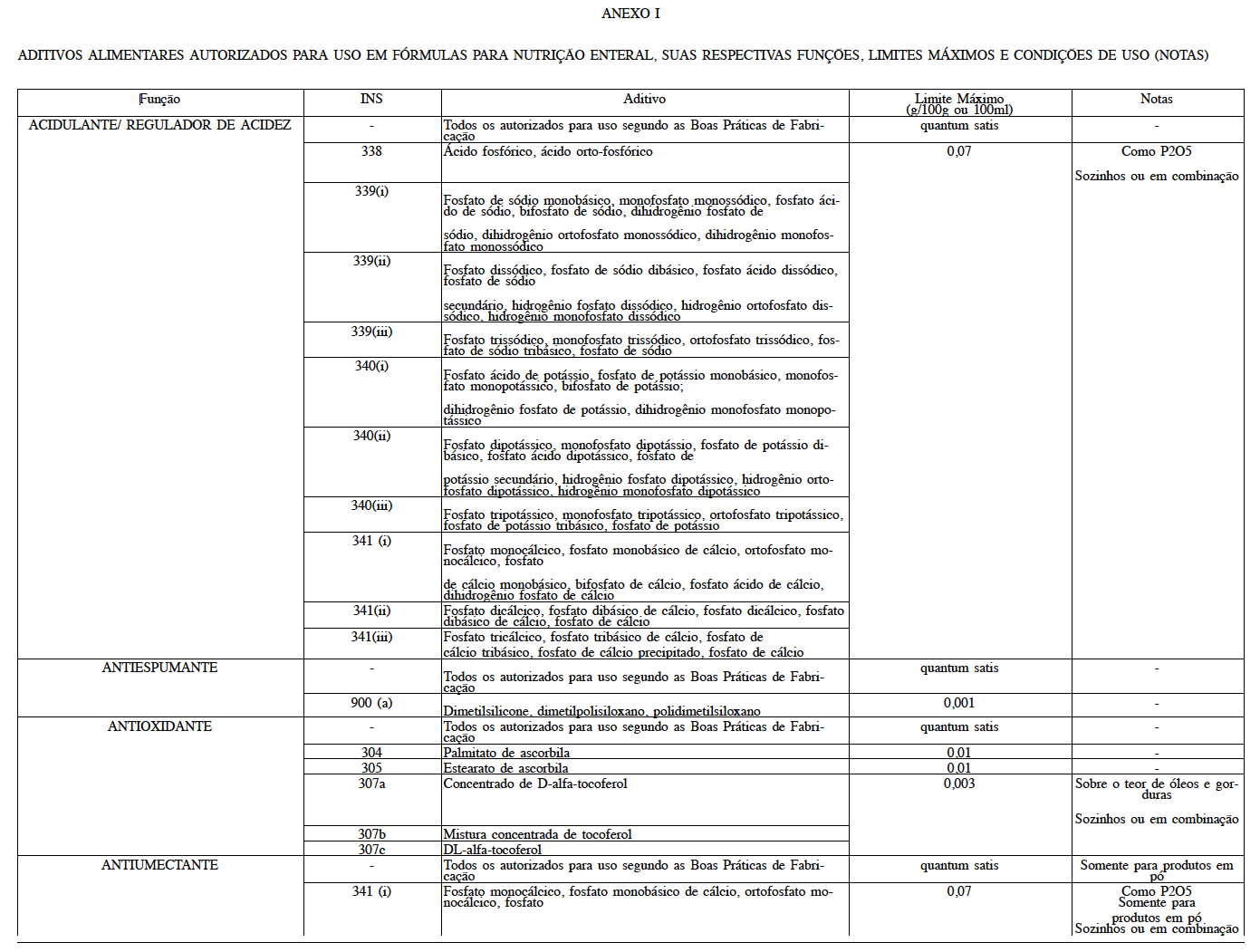Art. 2º Os aditivos alimentares autorizados para uso em fórmulas para nutrição enteral, suas respectivas funções, limites máximos e condições de uso encontram-se listados no Anexo I desta Resolução.