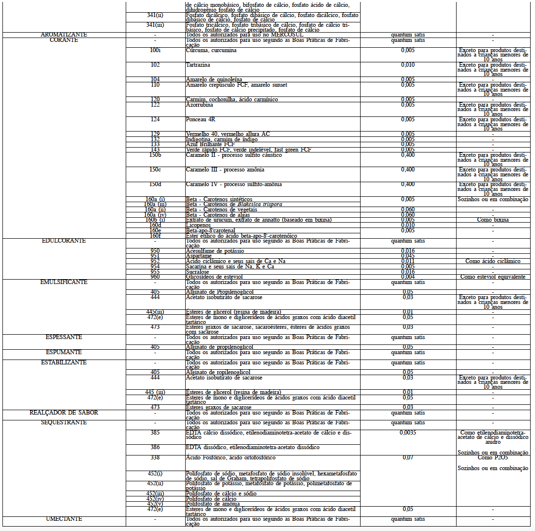§ 2º Quando forem utilizados dois ou mais aditivos alimentares com a mesma função tecnológica e para os quais existem limites máximos numéricos estabelecidos, a soma das quantidades destes aditivos no produto pronto para o consumo não pode ser superior ao maior limite estabelecido para o aditivo permitido em maior quantidade.