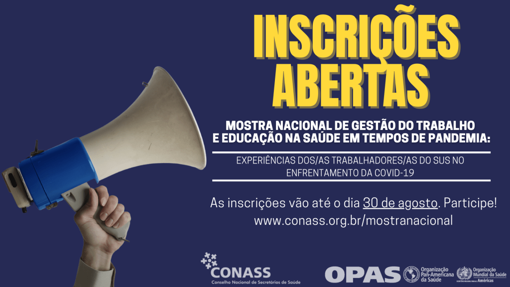 Atenção profissionais de saúde! Estão abertas as inscrições para a Mostra Nacional de Gestão do Trabalho e Educação na Saúde em Tempos de Pandemia, realizada pelo Conselho Nacional de Secretários de Saúde (Conass) com a participação da Organização Pan-Americana da Saúde (Opas/OMS).