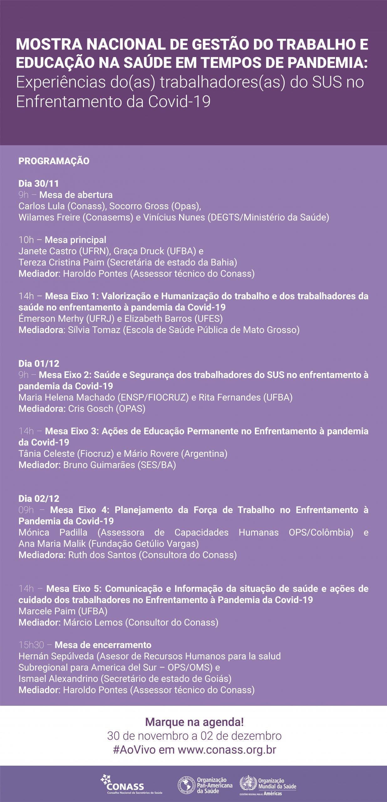 Entre os dias 30 de novembro a 02 de dezembro, o Conselho Nacional de Secretários de Saúde (Conass), irá apresentar os trabalhos selecionados para a Mostra Nacional de Gestão do Trabalho e Educação na Saúde em Tempos de Pandemia: experiências dos (as) trabalhadores (as) do SUS no Enfrentamento da Covid-19.