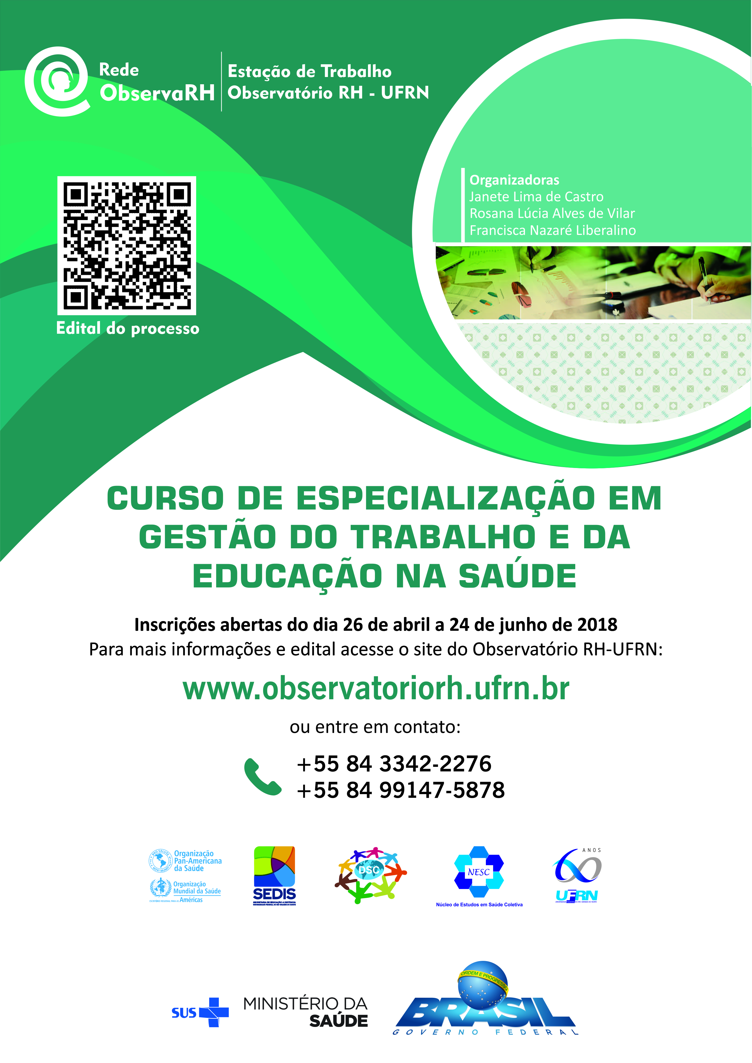 Ofertado em 2013 para trabalhadores do SUS da região Nordeste, em 2015 para a região Centro-Oeste e em 2016 para a região Norte, o curso será ofertado no segundo semestre de 2018 para as regiões Sul e Sudeste do Brasil. O edital do processo seletivo de alunos (Edital n.º 003/2018 – DSC/NESC/UFRN) está disponível no site do Sistema Integrado de Gestão de Atividades Acadêmicas (SIGAA) da UFRN (https://sigaa.ufrn.br/sigaa/public/processo_seletivo/lista.jsf?nivel=L&aba=p-lato) e as inscrições poderão ser realizadas até o dia 24 de junho do presente ano.