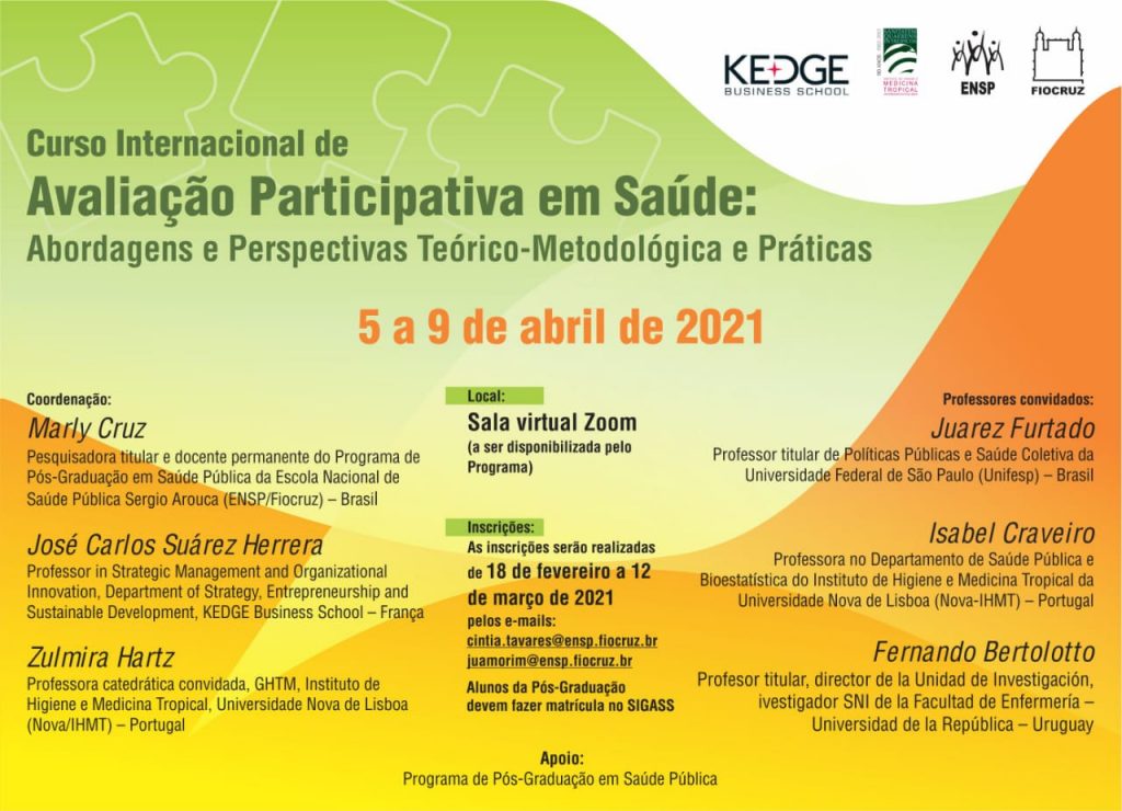 Este curso oferece uma visão panorâmica das diferentes abordagens da avaliação participativa, numa perspectiva teórica, metodológica e prática. De forma complementar aos aspectos epistemológicos da avaliação participativa, pretende-se compartilhar experiências de pesquisas avaliativas em saúde coletiva no âmbito nacional e internacional. Simultaneamente serão abordados os aspectos teóricos específicos aplicados ao campo da saúde coletiva e às boas práticas profissionais, assim como a importância das estratégias de uso coletivo dos achados do processo avaliativo.