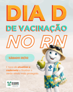 O próximo sábado (28) será de mobilização em todo o Rio Grande do Norte para mais um Dia “D” de Vacinação, dentro do Projeto Verão Protegido 2026. A iniciativa é uma recomendação da Secretaria de Estado da Saúde Pública (Sesap) aos municípios para intensificar a atualização da caderneta vacinal da população.