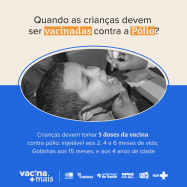 A Campanha Vacina Mais disponibilizou um pacote de peças de comunicação que abordam a importância da vacinação contra a poliomielite, também conhecida como paralisia infantil. Com o atual cenário das baixas coberturas vacinais no Brasil, o incentivo à imunização contra a pólio fica ainda mais urgente, e o conteúdo da Campanha Vacina Mais pretende somar-se às ações de comunicação para engajamento social e comunitário. As peças desse novo pacote são voltadas, principalmente, para a disseminação nas redes sociais, os posts apresentam aspectos da doença, as sequelas, dados sobre a baixa cobertura vacinal e a importância da vacina.