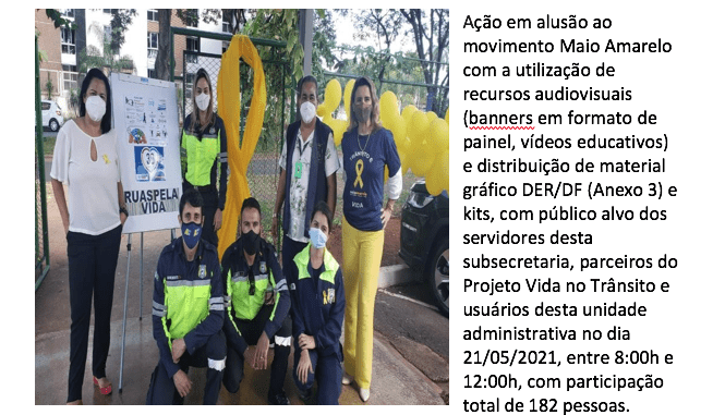 Solicitamos que enviem fotos das ações realizadas para o e-mail [email protected] para que possamos publicar nas mídias sociais do GDF e no site oficial do Maio Amarelo.