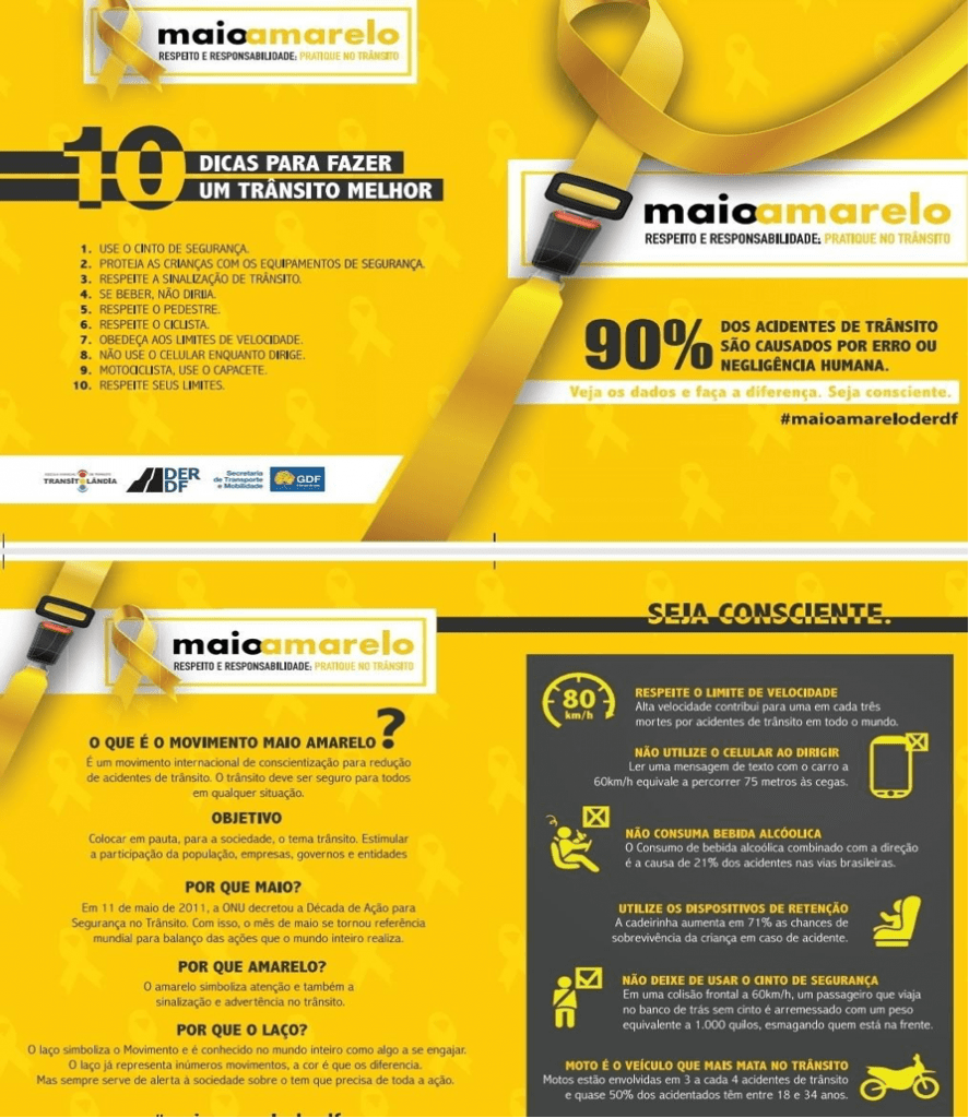 A Secretaria de Estado de Saúde do Distrito Federal (SES-DF) por meio da Gerência de Vigilância em Doenças e Agravos Não-Transmissíveis e Promoção da Saúde, Área Técnica de Prevenção de Acidentes e Mobilidade Saudável e do Programa Vida no Trânsito do Distrito Federal recomendam a realização de ações durante o mês de maio em alusão à campanha MAIO AMARELO.