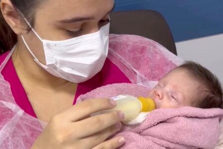 “A Laura ficou 20 dias entre UTI e UCI, intercalando o leite materno e a chuquinha com fórmula. Meu sonho sempre foi amamentar e, todos os dias, eu fazia a coleta no banco de leite antes da visita. Eu tinha esse medo dela não pegar o peito quando tivesse alta hospitalar. Quando ela saiu, nós fomos ao banco de leite e tivemos muito auxílio. Foi maravilhoso”, disse.
