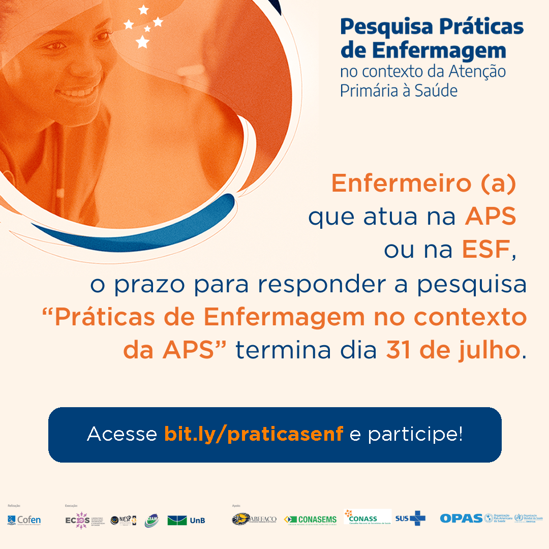 O prazo para enfermeiros (as) que atuam na Atenção Primária à Saúde participarem da pesquisa nacional que evidenciará as práticas de Enfermagem termina no dia 31 de julho. O objetivo do estudo é compreender essas práticas, cenários de atuação e perfis de enfermeiros e enfermeiras do Brasil.