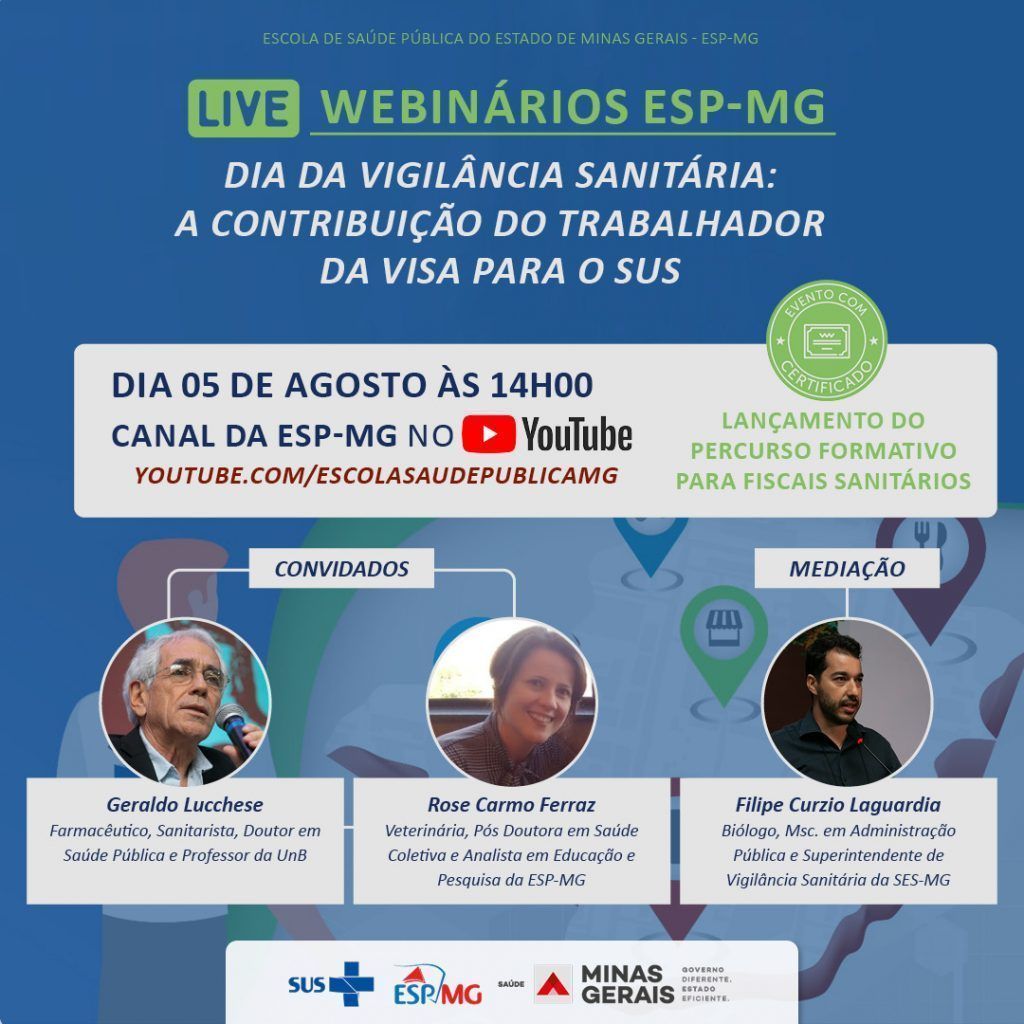 Com o objetivo de comemorar o dia Nacional da Vigilância Sanitária, a Escola de Saúde Pública do estado de Minas Gerais (ESP-MG) e a Secretaria de Estado de Saúde de Minas Gerais (SES-MG) realizam na próxima quinta-feira, dia 05/08, às 14h, o Webinário: “A contribuição do trabalhador da VISA para o SUS”.