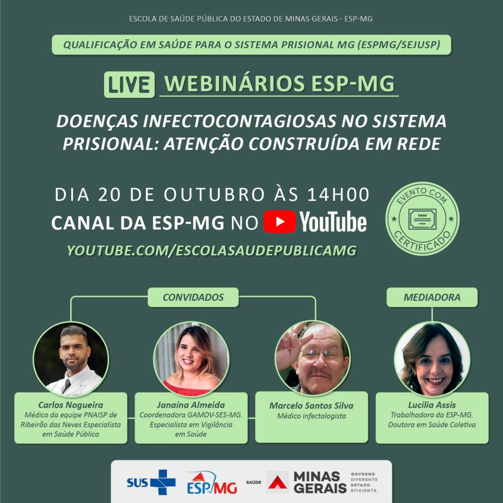 Este encontro integra as atividades do curso de Qualificação em Saúde para os Trabalhadores do Sistema Prisional de Minas GeraisA Escola de Saúde Pública do Estado de Minas Gerais (ESP-MG) realizará na próxima quarta-feira, dia 20/10, às 14h, o Webinário “Doenças Infectocontagiosas no Sistema Prisional: atenção construída em rede”.