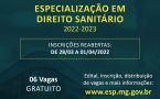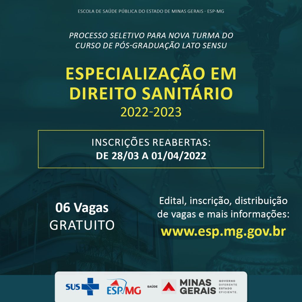 A Escola de Saúde Pública do Estado de Minas Gerais (ESP-MG) informa aos interessados que serão reabertas as inscrições para o processo seletivo de candidatos discentes ao Curso de Pós-Graduação – Nível de Especialização lato sensu em Direito Sanitário, no período das 17h de 28/03/22, até às 18h de 01/04/22.