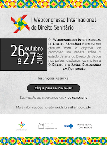 Já estão abertas as inscrições para o I Webcongresso Internacional de Direito Sanitário. O evento será realizado nos dias 26 e 27 de outubro de 2017 e vai reunir especialistas brasileiros e de outros países de língua portuguesa para apresentarem o conhecimento produzido atualmente na área de direito sanitário. Com o tema “O direito e a saúde dialogando em português”, o webcongresso é gratuito e as inscrições podem ser realizadas online, neste link. As palestras serão transmitidas pela internet e haverá um fórum que possibilite a troca de conhecimento entre os participantes. São esperados profissionais do direito e da saúde, pesquisadores, professores, estudantes, gestores e demais interessados no tema do direito sanitário e atuantes em países de língua portuguesa.