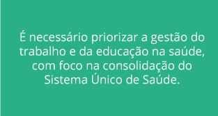 Levando em consideração as especificidades das políticas públicas de formação de profissionais para a saúde, e para atender às necessidades de um país do tamanho continental como o Brasil, é necessário priorizar, de fato, a gestão do trabalho e da educação na saúde, com foco na consolidação do Sistema Único de Saúde.
