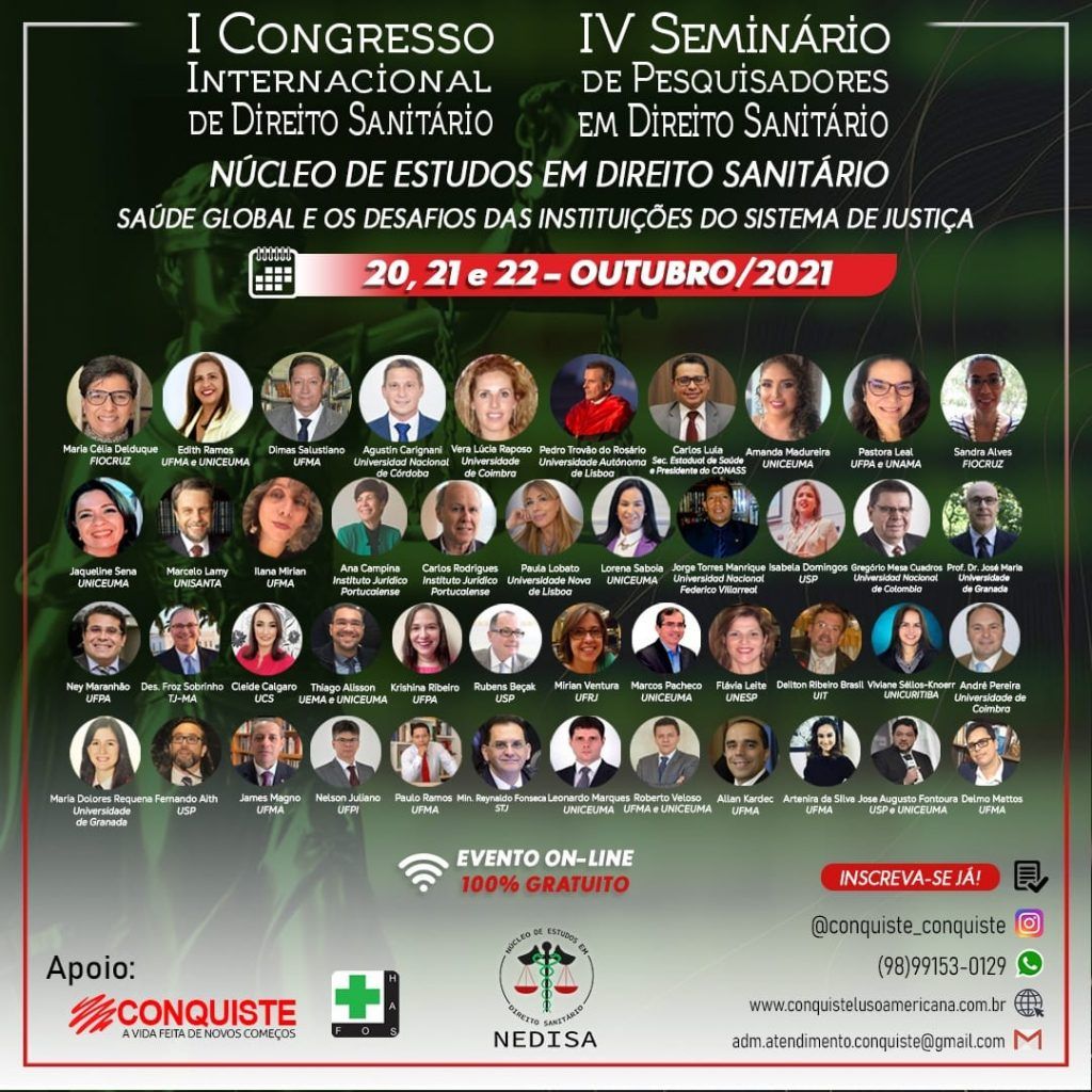 Estão abertas as inscrições para o I Congresso Internacional de Direito Sanitário e IV Seminário de Pesquisadores em Direito Sanitário que ocorrerá de forma on line, no período de 20 a 22 de outubro.