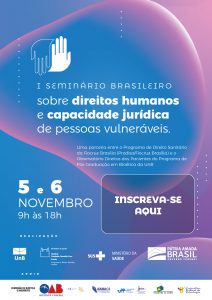 Em 2009, com a publicação do Decreto nº 6949, o ordenamento jurídico brasileiro internalizou a Convenção sobre os Direitos das Pessoas com Deficiência inaugurando um novo paradigma no regime da capacidade jurídica e autonomia pessoal desse grupo em situação de vulnerabilidade. Nesse contexto, o evento intitulado I Seminário Brasileiro sobre direitos humanos e capacidade jurídica de pessoas vulneráveis destina-se a debater a capacidade jurídica das pessoas vulneráveis, no paradigma dos direitos humanos, a partir da conjugação de experiências e reflexões interdisciplinares. Dias 5 e 6 de novembro.