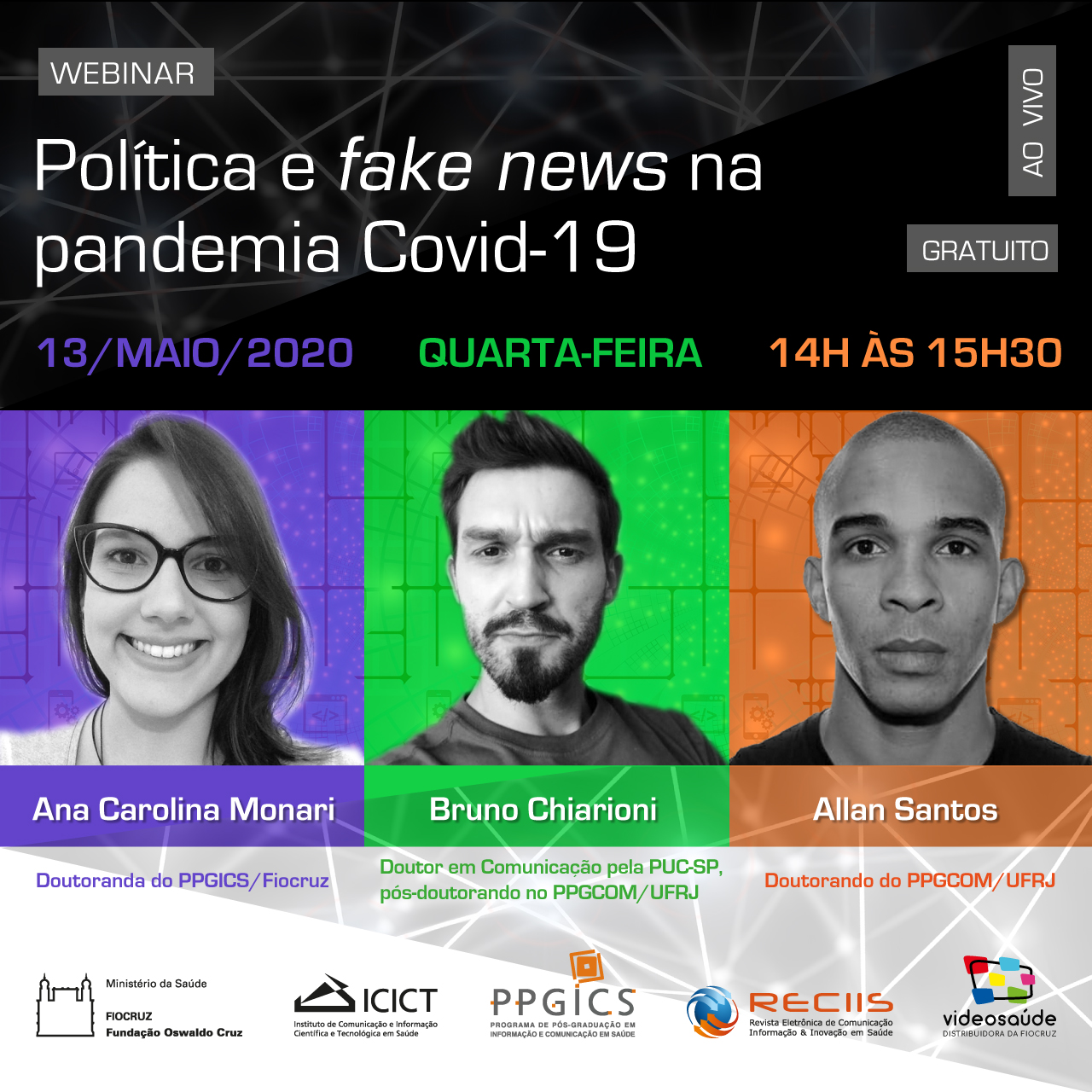 O PPGICS (Programa de Pós-Graduação em Informação e Comunicação em Saúde), em parceria com a Reciis e a VideoSaúde Distribuidora, realiza o webinar ‘Política e fake news na pandemia Covid-19’.O evento online será no dia 13 de maio (quarta-feira), das 14h às 15h30, por meio deste link: https://zoom.us/j/94902084366