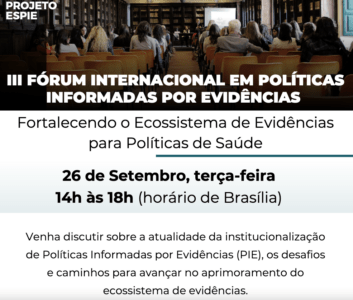 O projeto Apoio à Formulação e Implementação de Políticas Públicas de Saúde Informadas por Evidências (ESPIE) é desenvolvido pelo Instituto Sírio-Libanês de Ensino e Pesquisa do Hospital Sírio-Libanês (IEP/HSL), no âmbito do Programa de Apoio ao Desenvolvimento Institucional do Sistema Único de Saúde (PROADI-SUS), em parceria com o Departamento de Ciência e Tecnologia da Secretaria de Ciência, Tecnologia, Inovação e Insumos Estratégicos do Ministério da Saúde (DECIT/SCTIE/MS).