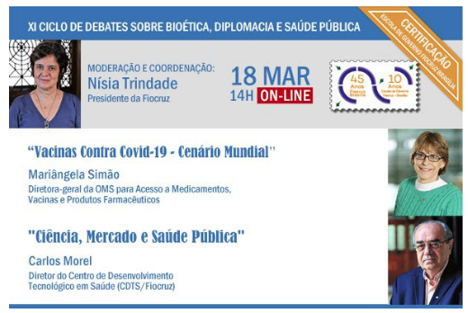 A primeira sessão, em 18 de março de 2021, será a partir das 14hs, com a vice-diretora-geral da Organização Mundial da Saúde (OMS), Mariângela Simão, responsável pela área de Acesso a Medicamentos, Vacinas e Produtos Farmacêuticos, e com o diretor do Centro de Desenvolvimento Tecnológico em Saúde (CDTS) da Fiocruz, Carlos Morel. A presidente da Fiocruz, Nísia Trindade, coordenará os debates.
