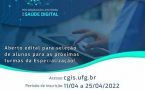 A Universidade Federal do Goiás (UFG), integrante da Rede UNA-SUS, abre inscrições para curso de especialização em nível de pós-graduação lato sensu em Saúde Digital (PLSSD). Ofertado na modalidade à distância, a especialização terá carga horária de 450h e duração de 12 meses. O curso é gratuito e as inscrições podem ser realizadas até 25 de abril de 2022, pelo link https://centrodeselecao.ufg.br/2022/plssd/.