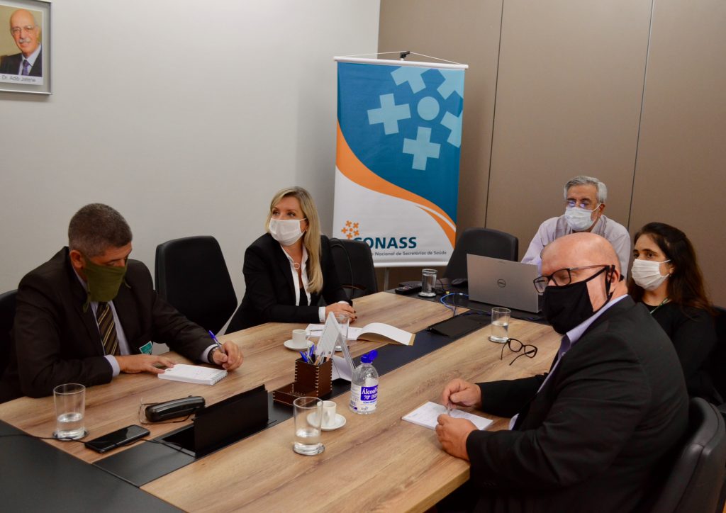 O secretário executivo (virtualmente), o coordenador técnico e a assessora jurídica do Conass, Jurandi Frutuoso, Fernando Cupertino e Alethele Santos, apresentaram ao grupo as principais preocupações do Conass, no que diz respeito à gestão do Sistema Único de Saúde (SUS) frente às consequências da pandemia e para a retomada das ações e serviços de saúde interrompidos ou reduzidos durante a sua vigência.