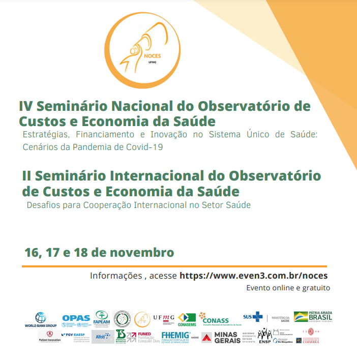 Os eventos serão online e gratuitos, ocorrerão nos dias 16, 17 e 18 de novembro de 2021. Estão sendo organizados pelo Núcleo Observatório de Custos e Economia da Saúde da UFMG em parceria com instituições nacionais e internacionais.