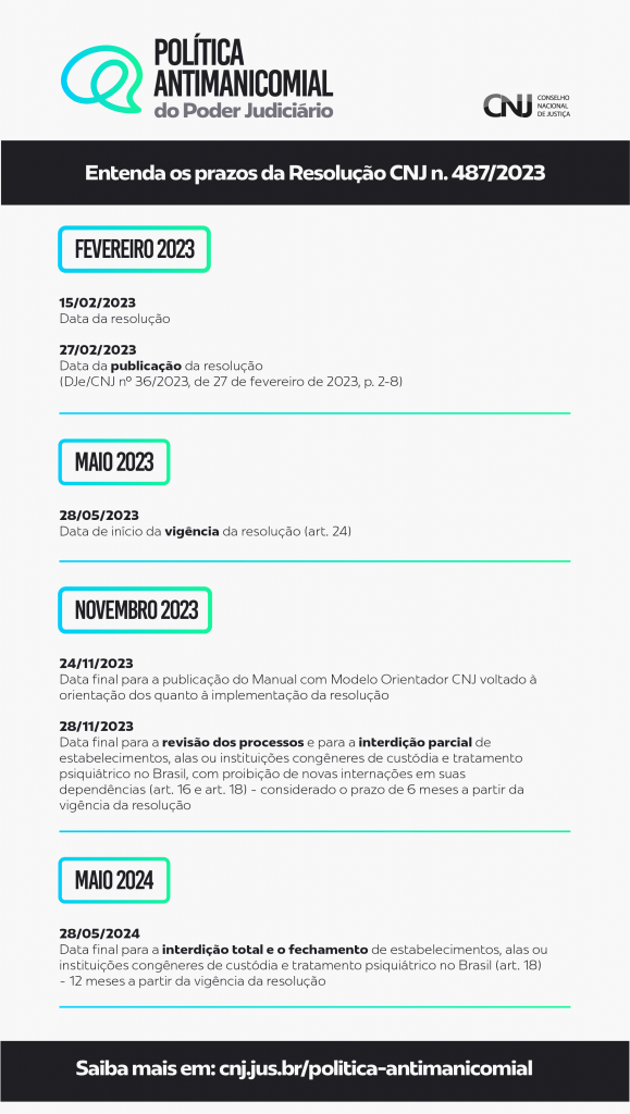 Também está prevista a solicitação, por parte do CNJ, de planos estaduais e distrital relativos à implementação da Política Antimanicomial pelo Judiciário em interface com a saúde, considerando os prazos e a necessária integração e articulação da Justiça com as redes de proteção social que atuam nesse campo, como os Centros de Atenção Psicossocial (CAPS). A união interinstitucional entre os Poderes Executivo e Judiciário na aplicação e implementação da Política Antimanicomial dá suporte aos estados para que a desinstitucionalização progressiva seja acompanhada de cuidados e garantias inerentes à temática e ao público em situação de extrema vulnerabilidade.