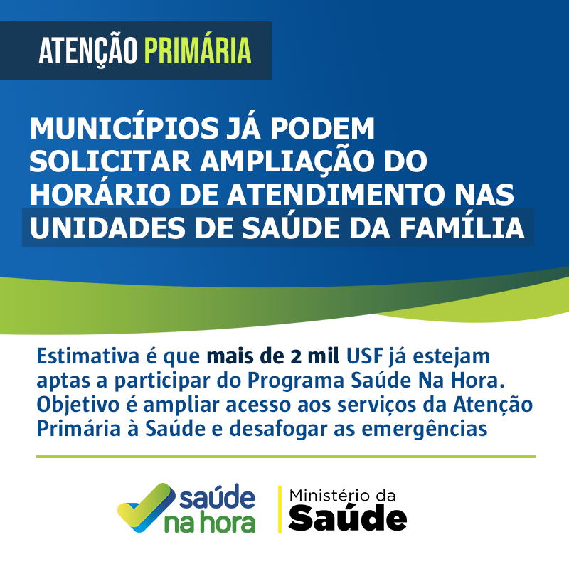 A iniciativa irá permitir que a população tenha maior acesso aos serviços da Atenção Primária, como consultas médicas e odontológicas, coleta de exames laboratoriais, testes de rastreamento para Infecções Sexualmente Transmissíveis (ISTs), triagem neonatal, aplicação de vacinas, acompanhamento pré-natal, entre outros procedimentos. Atualmente, a maior parte das 42 mil USF em todo o país funcionam 40h semanais, sendo que 336 unidades já expandiram o horário por decisão dos gestores locais e, agora, poderão receber mais recursos federais por aderirem à estratégia Saúde na Hora.