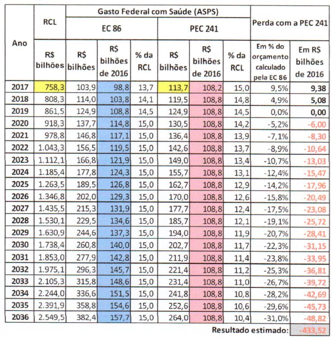 Segundo as projeções baseadas nos cálculos do Grupo Técnico Institucional de Discussão do Financiamento do SUS, e considerando a RCL para o ano de 2017, prevista pela PLOA, no valor de 758,3 bilhões de reais os prejuízos para o SUS, no período de vigência do novo regime fiscal, seriam da ordem de 433 bilhões de reais.