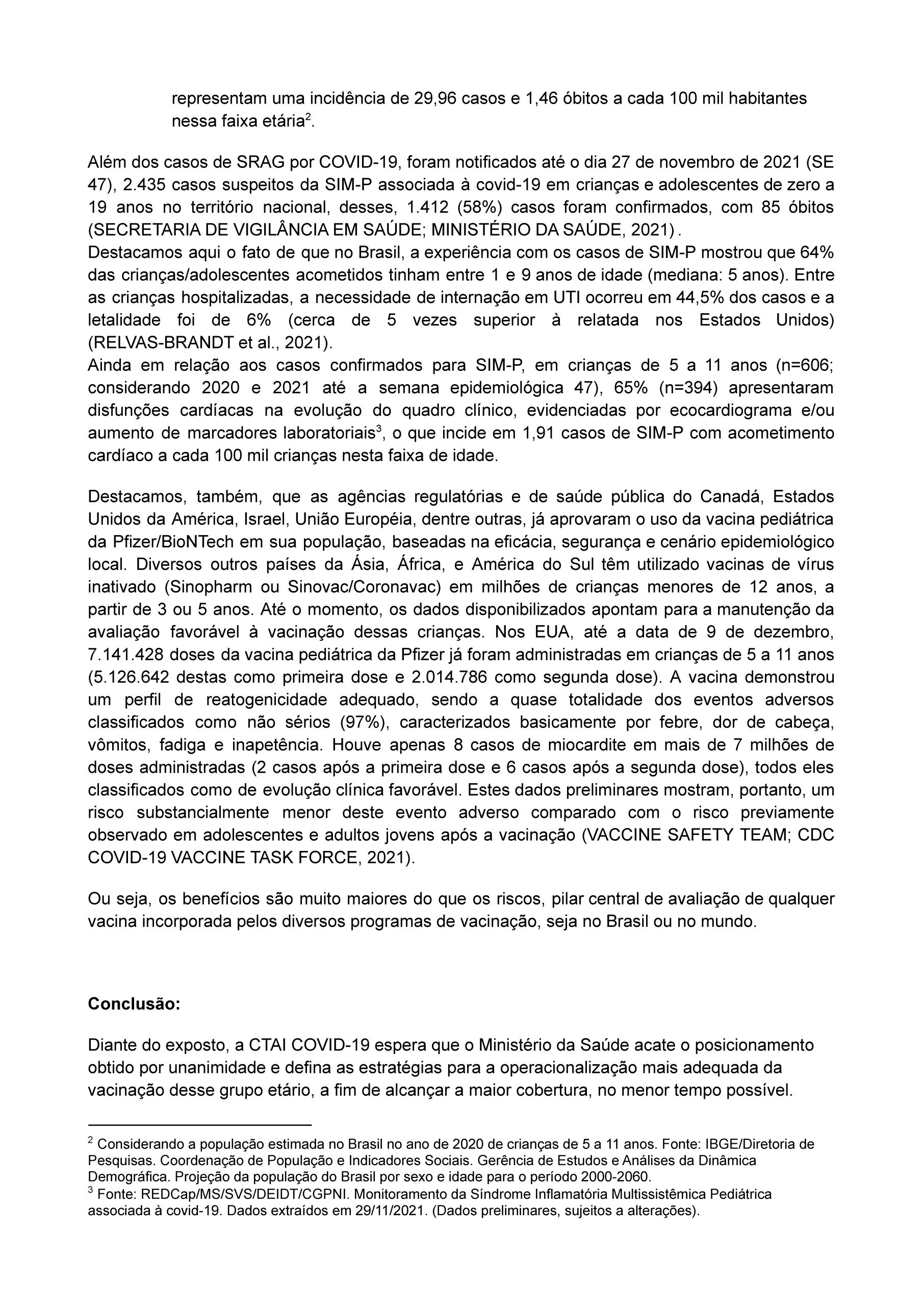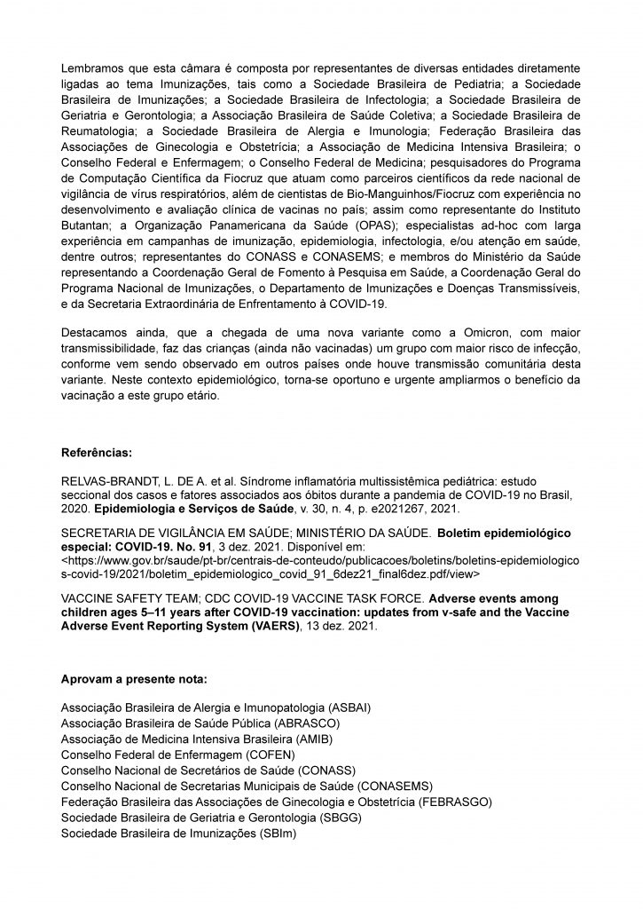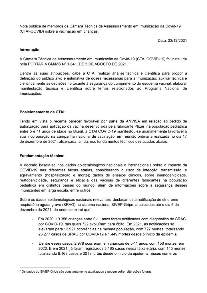 Em função da necessidade de elaboração de documento técnico pela Câmara Técnica de Assessoramento em Imunização da Covid-19 (CTAI-COVID), com o embasamento do apoio unânime dos presentes na reunião do dia 17/12/2021 à vacinação de crianças de 5 a 11 anos, diversos membros desta câmara redigiram o documento para subsidiar o documento oficial a ser elaborado pela SECOVID/MS.