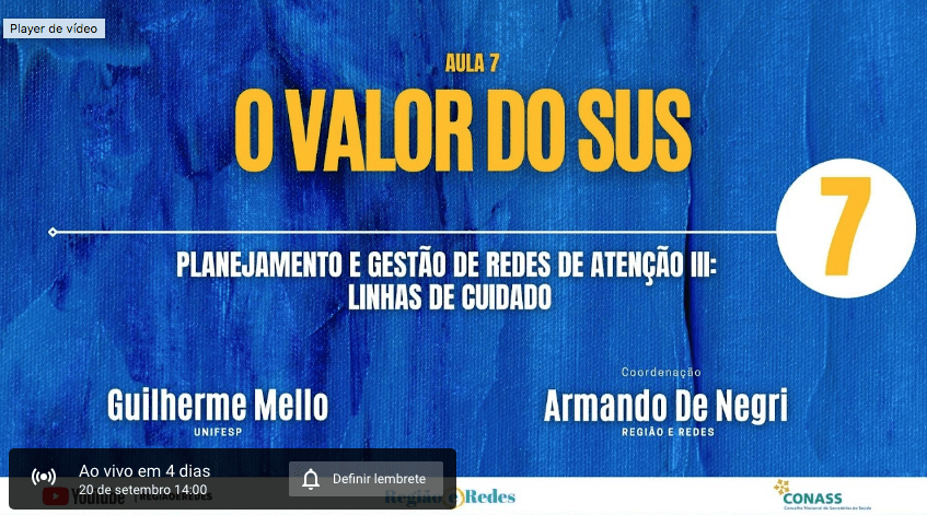 Chegamos a nossa sétima aula na série “O valor do SUS”. Dessa vez, o tema será “Planejamento e gestão de redes: linhas de cuidado”, com o professor Guilherme Mello (Unifesp), com a coordenação de Armando De Negri (Região e Redes). Este será o terceiro encontro do módulo “Redes de atenção e o cuidado integrado”. Mais abaixo, algumas informações sobre como acessar todas as aulas realizadas até aqui através do Canal Região e Redes no YouTube.