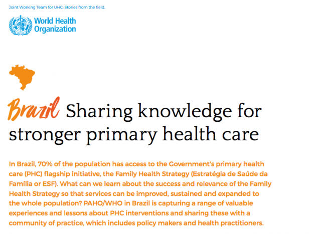 O Brasil tem um forte sistema de saúde e grande sucesso na prestação de serviços de APS. Portanto, a função da OPAS / OMS é um pouco diferente da de outros países, que podem precisar de apoio técnico mais forte. No Brasil, é necessário um novo modelo de cooperação. Uma grande variedade de partes interessadas está engajada neste próspero setor de saúde pública e, portanto, a OPAS optou por desempenhar uma forte função de gestão do conhecimento. A Organização trabalha com uma equipe de pesquisadores e profissionais de saúde para coletar e analisar informações sobre práticas bem-sucedidas na APS visando compartilhar as lições aprendidas de forma mais ampla.