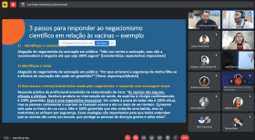 Para o combate a esses conteúdos, ponderou que é preciso haver monitoramento e esclarecimento o mais rápido possível. O que pode ser feito a partir do uso da imprensa, das redes sociais e demais canais de comunicação como linhas telefônicas e com o feedback de profissionais que trabalham na linha de frente.