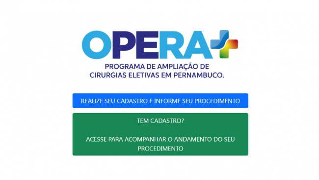 A partir desta quarta-feira (03/11) entra em funcionamento o ambiente online do Programa de Ampliação de Cirurgias Eletivas em Pernambuco, o Opera +, lançado pelo Governo de Pernambuco no último mês de outubro e que busca realizar 50 mil procedimentos a mais na rede estadual de Saúde até o final de 2022. O objetivo do portal (operamaispernambuco.saude.pe.gov.br) neste primeiro momento é cadastrar os pernambucanos que tiveram suas cirurgias adiadas na rede hospitalar sob gestão estadual durante a pandemia da Covid-19 e, a partir disso, realizar os encaminhamentos necessários para a realização do procedimento, com consulta e exames pré-operatórios e, posteriormente, o acompanhamento pós-cirúrgico.