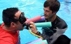 Também conhecida como mergulho autônomo, a prática prevê o uso de equipamentos para respiração e locomoção embaixo da água. Na modalidade acompanhada, que é executada na piscina do hospital, uma dupla mergulha de modo cooperativo. O instrutor de mergulho Sérgio Simão explica: “Nesse caso, é preciso estabelecer uma forte relação de confiança. O ambiente do HAB favorece isso. Percebemos que os pacientes têm completo comprometimento com o que orienta a equipe que os acompanha diariamente. Isso permite que realizemos uma prática segura e proveitosa”.