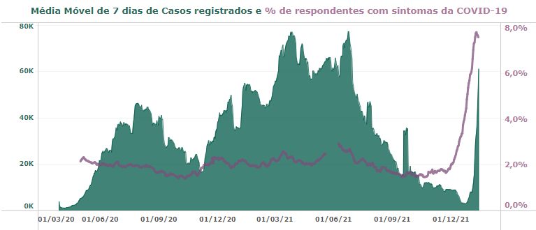 No dia 23 de novembro do ano passado, a média móvel de usuários que relataram sintomas relacionados à Covid-19 era 1,6% dentre os entrevistados pela enquete. Já em 13 de janeiro, data da última atualização dos dados, a média móvel atingiu o patamar de 7,6% de usuários que confirmam episódios de febre junto com tosse, falta de ar ou dificuldade para respirar. Para efeito de comparação, a proporção é mais que o dobro da relatada em 9 de junho de 2021, maior pico da pandemia até então. Nessa data, o relato de sintomas era feito por 2,9% dos usuários que responderam ao questionário. O crescimento é registrado em um período em que o Brasil vive um avanço concomitante da variante ômicron e da influenza. O painel não permite uma separação entre os casos das duas doenças, cujos sintomas são semelhantes.
