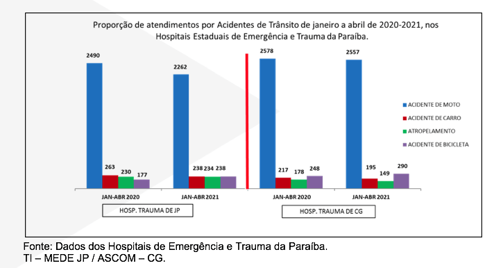 No primeiro quadrimestre de 2021, foram registrados 2.972 atendimentos por acidentes de trânsito no Hospital de Emergência e Trauma Senador Humberto Lucena, localizado em João Pessoa, para atendimentos de acidentes de motocicleta, carro, bicicleta e atropelamentos. Já no Hospital de Emergência e Trauma Dom Luiz Gonzaga Fernandes, em Campina Grande foram realizados 3.191 atendimentos por acidentes de trânsito. No mesmo quadrimestre de 2020, foram registrados 3.130 atendimentos no hospital de Trauma de João Pessoa e 3.221 no hospital de Trauma de Campina Grande. Houve uma redução no número de atendimentos por acidentes de trânsito nos dois hospitais de Trauma da Paraíba, quando comparado ao mesmo período quadrimestral em 2020, sendo os acidentes mais frequentes por motocicleta e aumento significativo dos atendimentos por acidentes de bicicleta.