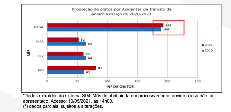 Apesar da redução do número de atendimentos no primeiro quadrimestre de 2021 nos Hospitais de Emergência e Trauma da Paraíba, o número de óbitos por acidentes de trânsito no primeiro trimestre deste ano aumentou (n= 193), quando comparado ao mesmo período de 2020 (n= 189). Diante desse cenário, intervenções intersetoriais contínuas, direcionadas com foco em fatores de risco prioritários (álcool e direção, velocidade excessiva ou inadequada) e para os grupos de vítimas prioritários (motociclistas, pedestres e ciclistas) são necessárias.