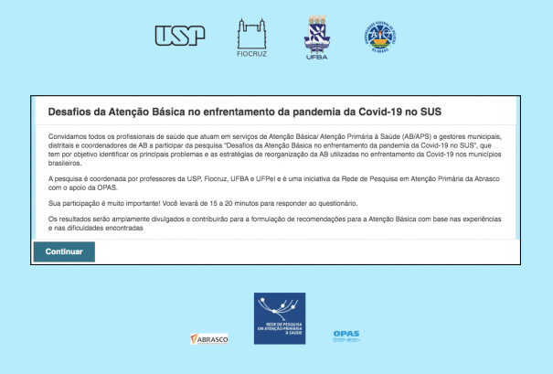 Por iniciativa da Rede de Pesquisa em Atenção Primária à Saúde da Abrasco, com apoio da Organização Pan-Americana da Saúde (OPAS) no Brasil, está em desenvolvimento a pesquisa “Desafios da Atenção Básica no enfrentamento da pandemia da Covid-19 no SUS”. A pesquisa tem por objetivo identificar os principais problemas e as estratégias de reorganização da Atenção Primária à Saúde (APS) utilizadas no enfrentamento da Covid-19 nos municípios brasileiros por meio de inquérito on line com profissionais de saúde e gestores e gerentes da principal porta de acesso ao Sistema Único de Saúde (SUS).