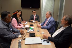 A secretária Especial de Saúde Indígena (Sesai), do Ministério da Saúde, Silvia Waiãpi, e seus assessores, estiveram na sede do Conass nesta quarta-feira (25). O presidente do Conselho, Alberto Beltrame, e o secretário de Saúde do Maranhão, Carlos Lula, apresentaram à equipe da Sesai o projeto de Planificação da Atenção à Saúde (PAS) e detalharam a reunião de trabalho que ocorrerá na próxima segunda (30), em Barra do Corda, no Maranhão, região cuja maioria da população é indígena.