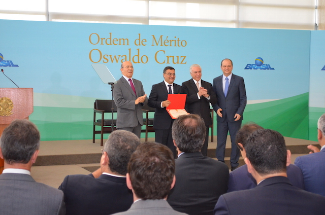 Brasília – O presidente do CONASS, secretário de Estado da Saúde do Paraná, Michele Caputo Neto, foi condecorado pelo presidente da República, Michel Temer e pelo ministro da Saúde, Ricardo Barros, nesta terça-feira (27), com a Medalha de Mérito Oswaldo Cruz, por sua atuação destacada na área da saúde pública.